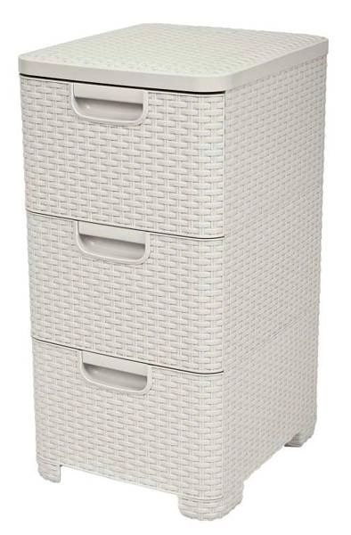 Praktyczny regał o nowoczesnym designie przyda się w każdym domu. Posiada trzy pojemne szuflady, które są wytrzymałe i co najważniejsze bardzo łatwe w czyszczeniu. Każda z nich posiada uchwyt, nie wystający poza obręb kosza. Wysokiej jakości materiał, z którego jest zrobiony przypomina w swojej strukturze popularny rattan, który idealnie wpisuje się w każdy wystrój wnętrz.