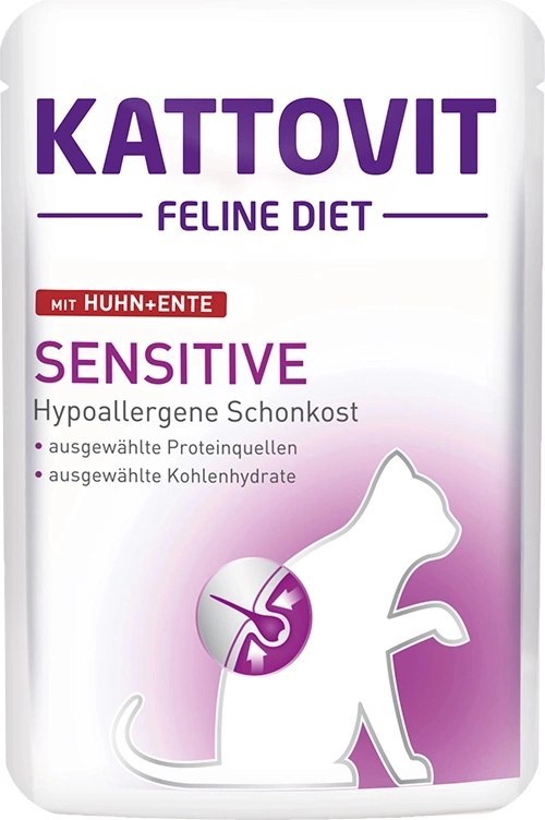 Kattovit Feline Diet Sensitive został opracowany dla wrażliwych kotów, które cierpią na określone alergie pokarmowe, o smaku kurczaka z kaczką.