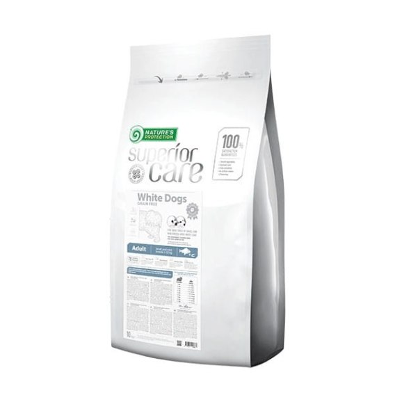 Nature's Protection Superior Care White Dogs Grain Free White Fish Adult Small Breeds - biała ryba dla dorosłych psów małych, białych ras 1 kg to bezzbożowa karma super premium, opracowana z myślą o dorosłych psach małych i miniaturowych ras o białym umaszczeniu (1-10 kg). Specjalna formuła pomaga zapobiegać powstawaniu rdzawych zacieków wokół oczu, pyska i łap, utrzymując naturalną biel sierści.